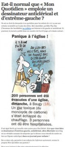 Sous le titre « Est-il normal que « Mon Quotidien » emploie un dessinateur anticlérical et d’extrême-gauche ? », le site de « réinformation » dénonce violemment le dessinateur et son blog personnel, et prend prétexte d’un dessin anodin (voir illustration, cliquez dessus pour l’agrandir) pour publier une lettre de dénonciation à envoyer à la rédaction de Mon quotidien.