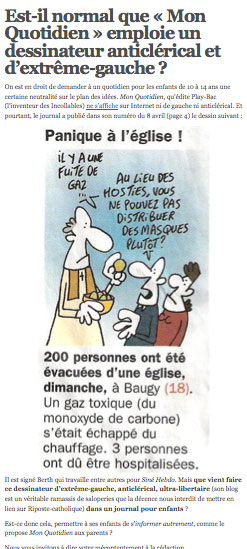 Le site « Riposte-catholique.fr » pourrait se demander, entre autre, s’il est normal que des hommes d’églises soient pédophiles pratiquants, mais il préfère s’interroger sur le fait que le dessinateur Berth collabore à Mon quotidien.
