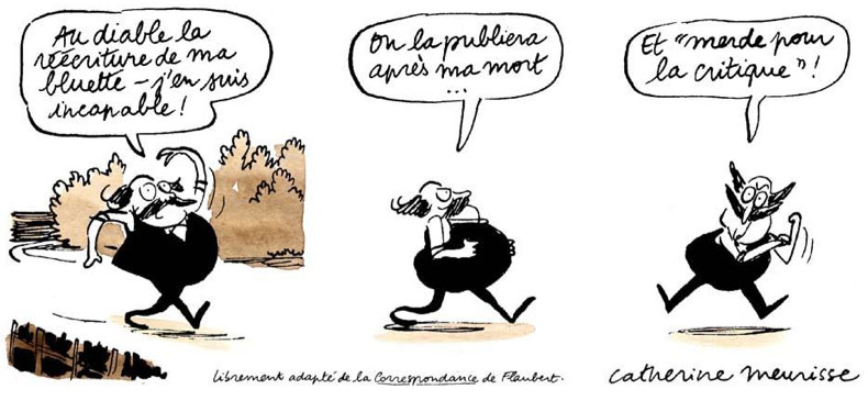 La dessinatrice Catherine Meurisse, auteure de « Mes hommes de lettres : Petit précis de littérature française » (éditions Sarbacane), et collaboratrice d’un journal satirique paraissant le mercredi – qui n’est pas Le Canard enchaîné -, a planché en dessins pour Libération sur un sujet de la série L du bac 2010 portant sur des textes de Gustave Flaubert.