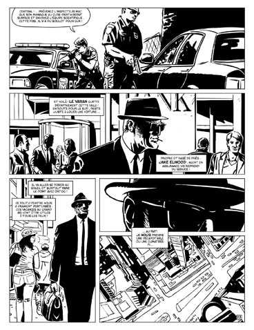 Surtout par rapport à la doc. Une voiture de flic, sur du papier, c’est lourd. Soit on la redessine complètement en s’appuyant sur la doc et ça demande un temps fou. Soit on fait comme Francq, le dessinateur de Largo Winch, qui fait des repérages photos, qui les projette et qui les décalque. Tous les dessinateurs réalistes sont obligés de trouver ce genre de solution par rapport à la doc. Après, il y a une interprétation, le cadrage, la mise en scène, etc. L’informatique fait gagner un temps fou. Il n’y a pas à reprendre le crayon, passer à la table lumineuse, tout ça. Il y a une forme de spontanéité.