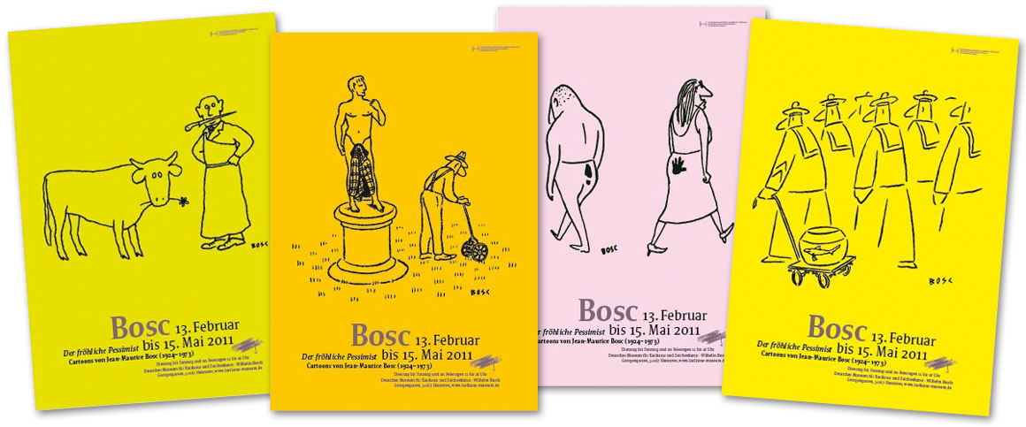 Les sites Caricatures et caricature et celui de l’EIRIS annonçent concomitamment la prochaine exposition consacrée à Bosc, présentée du 13 février au 15 mai 2011 au Wilhelm Busch Museum de Hanovre, haut lieu de la célébration du dessin d’humour en Europe.