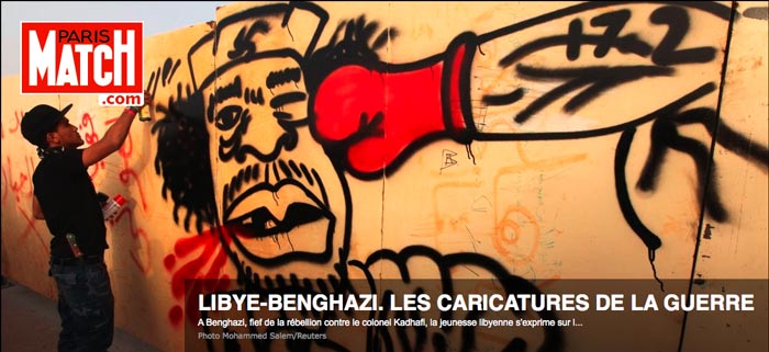 Après le site du quotidien 20 minutes, c’est Paris Match.com qui consacre un diaporama aux dessins anti-Kadhafi que l’on peut voir sur les murs de Benghazi en Libye.