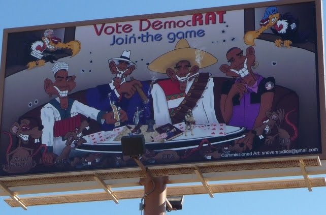 Ces caricatures  sont entourées de faucons et de rats représentant , Georges Soros, l’ONU, ou les grands organismes d’État que sont l’IRS (impôts), EPA (agence de protection de l’environnement), ou la FED (banque centrale américaine). La caricature est surmontée du slogan « Joignez-vous au jeu, votez démocRATe ».