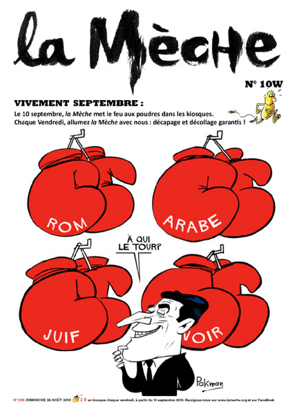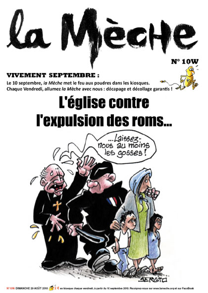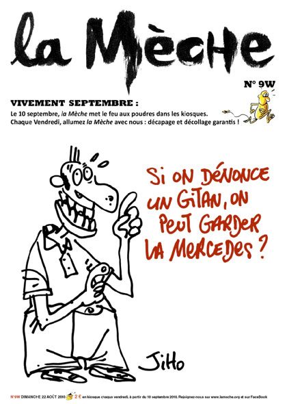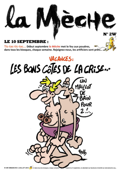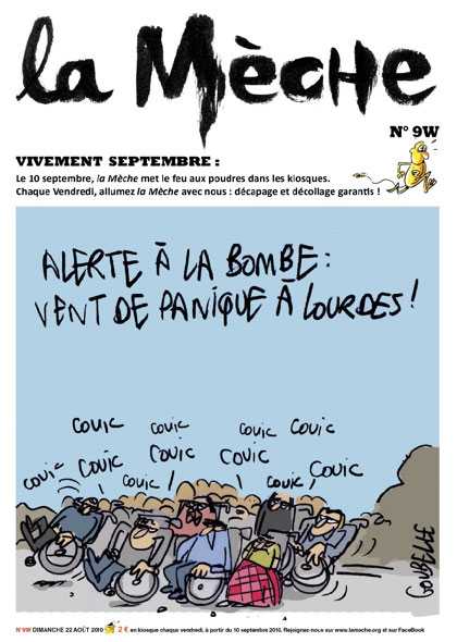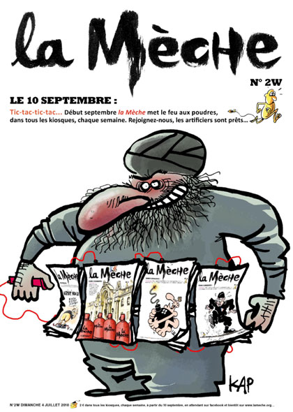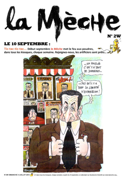 Dernière ligne droite pour l’équipe de La Mèche qui prépare son n°1 à paraître le vendredi 10 septembre 2010. En attendant cette date qui nous dira si les anciens collaborateurs de Siné Hebdo ont réussi leur pari de succéder à ce titre, un petit aperçu de leur humour avec quelques dessins publiés sur le site Internet du futur hebdo satirique.
