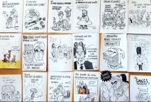 En lice pour cette Une anniversaire, une série de caricatures affichées au mur. Après quelques débats, une seule est retenue. Les neuf autres, choisies de façon “autoritaire” plaisante Charb en les triant, feront partie des “unes auxquelles vous avez échappé”. Quelques autres seront postées sur le site de l’hebdomadaire humoristique, mais pas toutes. “Si on met tout sur le net, on est mort”, tranche-t-il.”