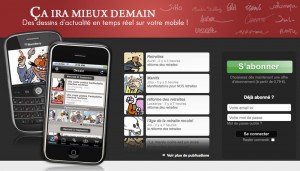Désormais vous pourrez recevoir les dessins sur l’actualité de Aurel, Jiho, Tignous, Lasserpe, Chapatte, Gros, Jul, Maëster, Colcanopa, Martin Vidberg, Plantu, sur votre téléphone portable IPhone et bientôt sur votre Blackberry, ou votre Ipad, en vous abonnant à « Ça ira mieux demain », nouveau support de diffusion du dessin de presse.