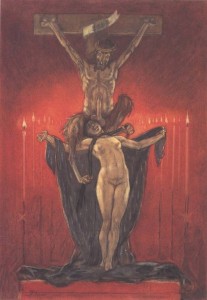 Illustration publiée par Le Monde : Le calvaire dessiné par Félicien Rops qui montre un Christ en érection devant Madeleine, une des cinq planches de la série intitulée Les Sataniques, datant de 1882. Cliquez sur l’image pour l’agrandir.