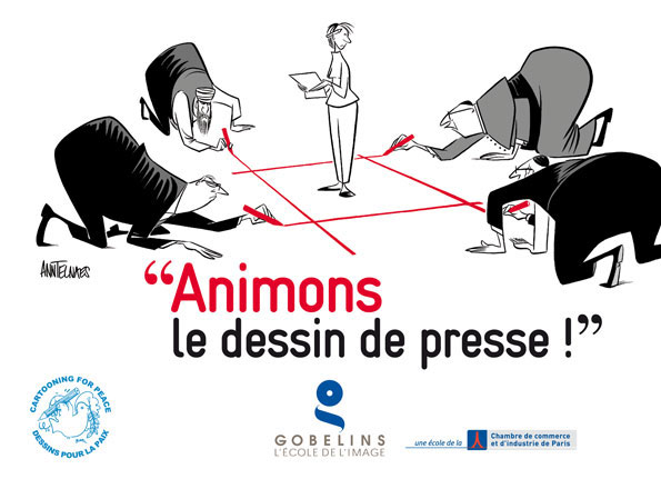 Gobelins, l’école de l’image, et l’association pour la Fondation Cartooning for Peace présidée par Plantu présentent : « Animons le dessin de presse ! ». L’exposition réunira, du 13 janvier au 25 février 2011, une cinquantaine de dessins de presse de la collection de l’Association, 25 films d’animation et leurs dessins préparatoires réalisés par les élèves concepteurs réalisateurs de films d’animation de Gobelins, l’école de l’image.