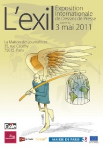« L’exil » est le thème de l’exposition internationale de dessins de presse présentée à partir du 3 mai 2011 à La Maison des journalistes, 35, rue Cauchy 75015 Paris.  Parmi les 40 dessinateurs du monde entier, les français Plantu, Coco, Pinter, Biz, Biz (Bizalion), Guezou.