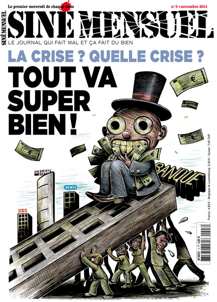 Et de 3 ! Le nouveau numéro de Siné mensuel sera dans les kiosques le 3 novembre 2011. Le dessin de couverture est signé Matthias Lehmann (en illustration) et l’on trouve dans les 32 pages toutes en couleurs, Willis de Tunis, la dessinatrice tunisienne qui commente les élections dans son pays, Mix & Remix qui se défoule dans sa pleine page, tout comme Jiho, Berth, Lindingre, Faujour, Willem, Diego Aranega et Carali.