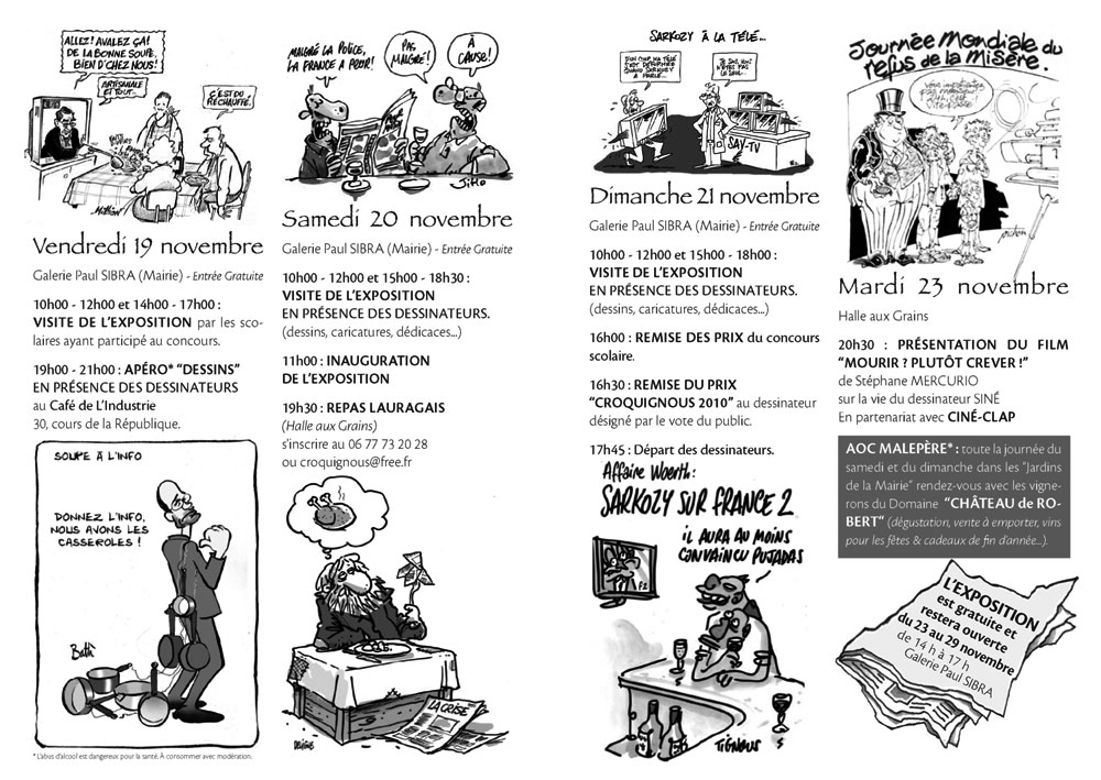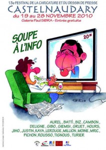 Les dessinateurs Aurel, Batti, Biz, Cambon, Deligne, Gibo, Giemsi, Gruet, Hours, Jiho, Justin, Kaya, Lerouge, Million, Moine, Mric, Pichon, Rousso, Tignous, Turier, sont au programme du « 13e Festival de la caricature et du dessin de presse de Castelnaudary » qui aura lieu du 19 au 28 novembre 2010 à la galerie Paul Sibra.