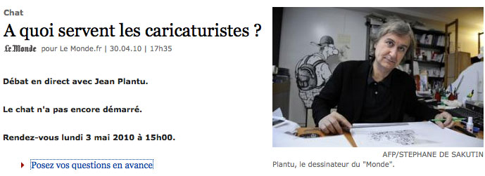 « A quoi servent les caricaturistes ? », c’est le thème du débat organisé le lundi 3 mai 2010 à 15h par le site du quotidien Le Monde avec la participation du dessinateur Plantu.