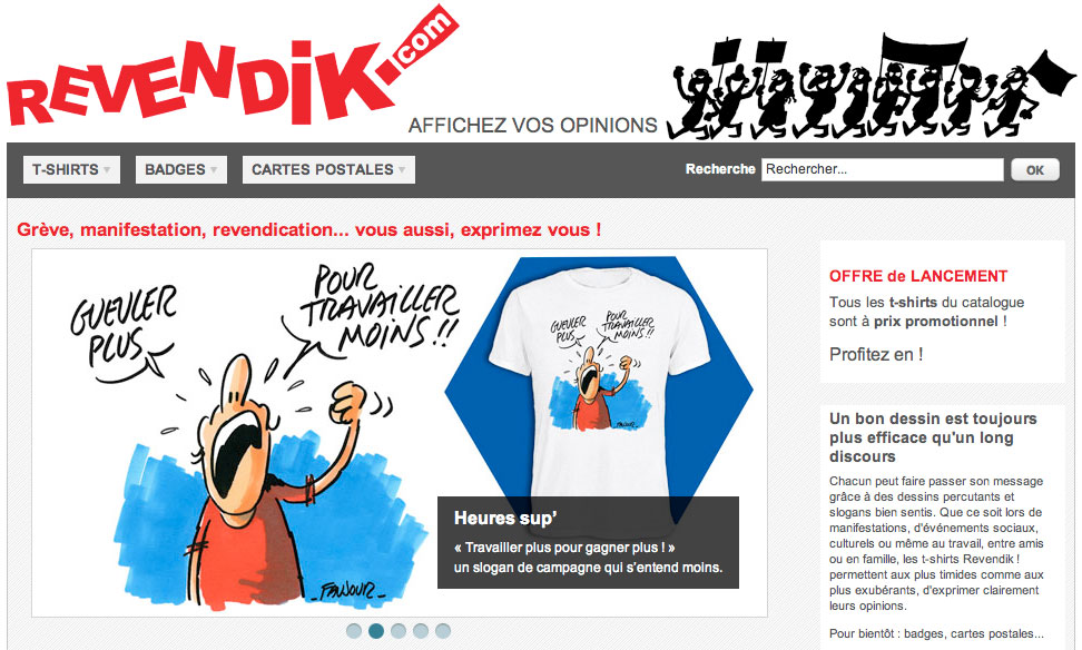 Si les journaux et les expositions sont d’excellents supports pour permettre aux dessinateurs de s’exprimer, il faudra désormais compter avec les T-shirts. Revendik.com édite une série de T-shirts avec des dessins de Faujour, Soulcié, Cambon, Mutio, Barbe, M’Ric, Dobritz, Phillipe.