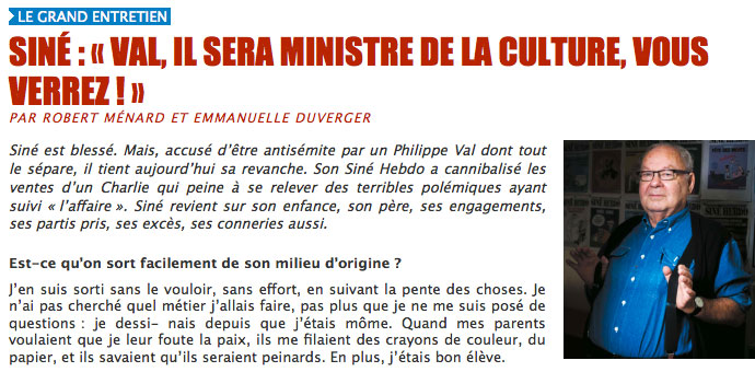 Le dessinateur Siné a accordé un très long entretien à la revue Médias (n°24 – printemps 2010). Sur onze pages, interrogé par Emmanuelle Duverger et Robert Ménard, il évoque sa vie, son métier, et reviens sur la création de Siné Hebdo.