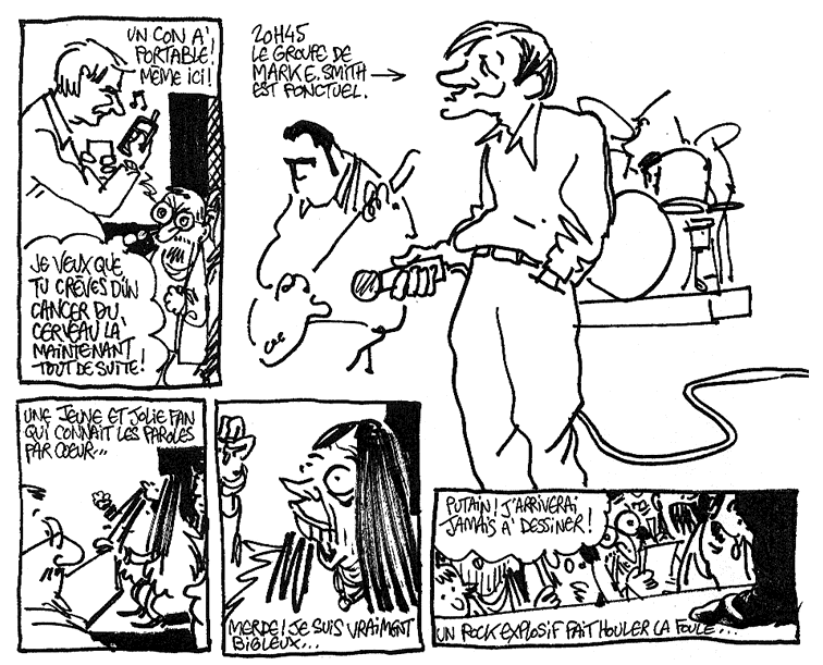 On trouve même en farfouillant sur l’Internet sept pages sur « The Fall en concert », une bande dessinée de Luz parue dans le n°1 de la revue Hit Records en janvier 2002 (Stéreoscomic). Extrait en illustration.
