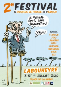 Les 3 et 4 juillet 2010, c’est la ville de Labouheyre, dans les Landes, qui accueillera Tignous, Jiho, Lasserpe, Mric, Lerouge, Besseron, Gros, Biz, pour le « 2ème Festival de dessins de presse et d’humour », place de la mairie. L’affiche est signée Jiho.