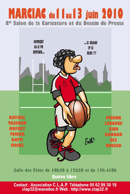 Le très intéressant site « Caricatures & et caricature.com »  annonce le « 8ème salon des caricatures et du dessin de presse de Marciac », dans le Gers,  qui se déroulera du 11 au 13 juin 2010, salle des fêtes, de 10 h 30 à 12 h 30 et de 15 heures à 18 heures. Sont annoncés les dessinateurs, Raynal, Tassuad, Mofrey, Turier, Batti (qui préside la manifestation et signe l’affiche), Moine, Pichon, Lerouge, Gibo, Haddad, Biz, Rousso. Le thème de cette édition est le rugby.