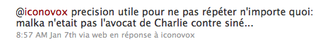 mercredi 12 janvier 2011Trouvé ce message sur le compte Twitter de Charlie Hebdo en référence à la reprise dans ce blog d’un extrait de la « Zone » de Siné consacré à l’avocat Richard Malka :