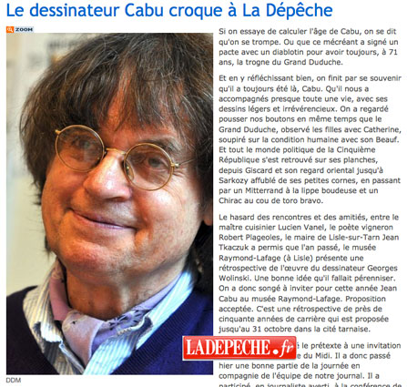 Quelques jours plus tôt (25 septembre 2009),  Cabu était reçu en grandes pompes par La Dépêche du Midi à l’occasion de l’exposition de 300 dessins présentée au Musée Raymond Lafage de Lisle-sur-Tarn jusqu’au 31 octobre 2009.