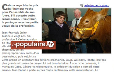 Le populaire - Article sur CabuÀ 71 ans, Cabu est enfin récompensé pour l’ensemble de son œuvre avec le Grand prix de l’humour vache que vient de lui décerner le 28ème Salon international du dessin de presse et d’humour de St Just-le-Martel.