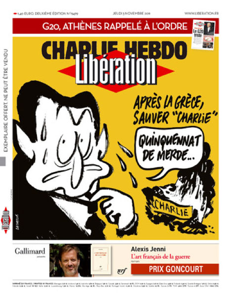 En attendant le quotidien Libération qui a offert l’hospitalité de ses locaux à la rédaction de l’hebdomadaire publie le 3 novembre 2011 un numéro spécial avec une couverture signée Catherine Meurisse et un supplément de 4 pages consacrées à l’incendie du journal. Son directeur Nicolas Demorand écrit :
